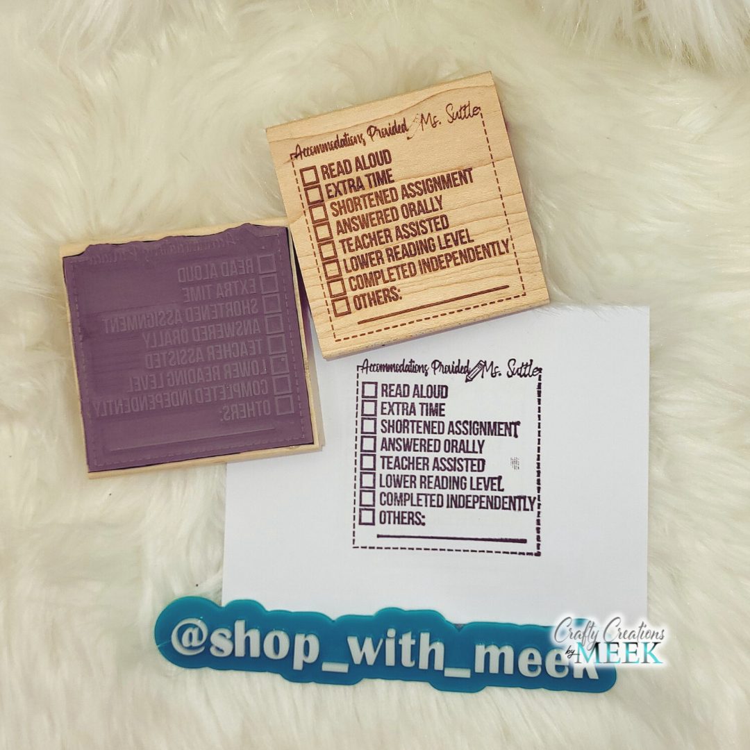 Elevate your special education classroom with our Special Education Accommodation Stamp. As a teacher, easily track and monitor student progress using this rubber stamp on a wooden block. Its included checklist makes it simple to ensure all necessary accommodations are being met. Expertly designed to streamline your teaching experience.