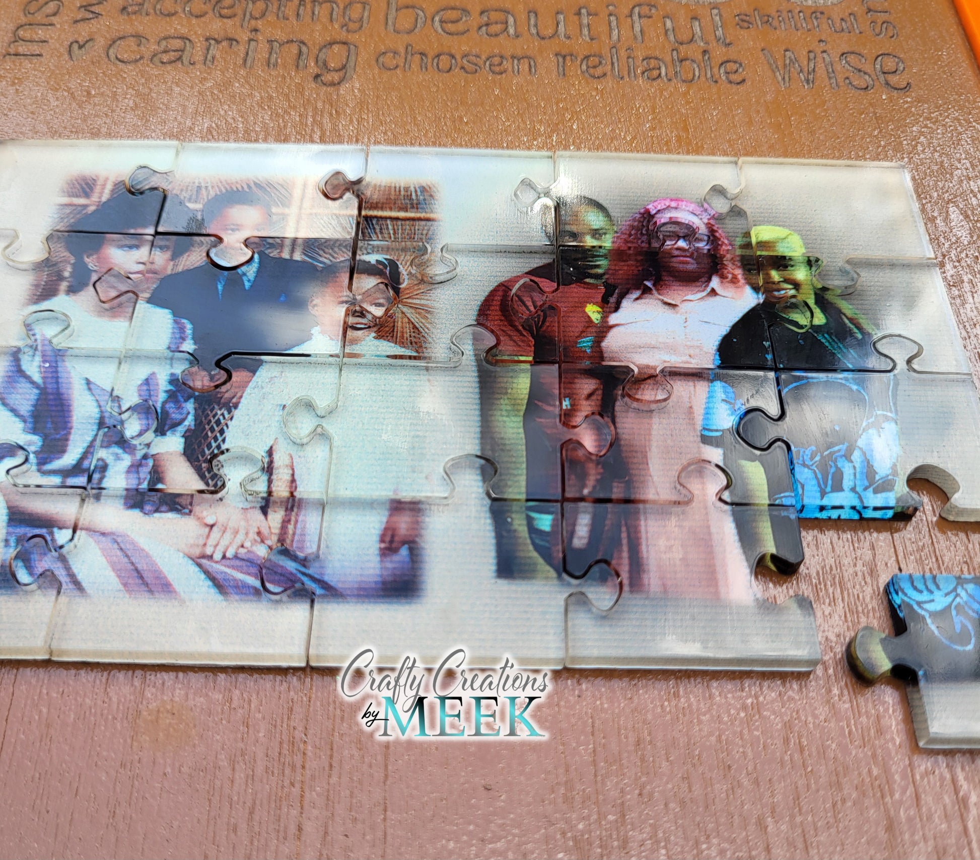 Materials: Wood backing, acrylic puzzle photo, sturdy acrylic frame outline