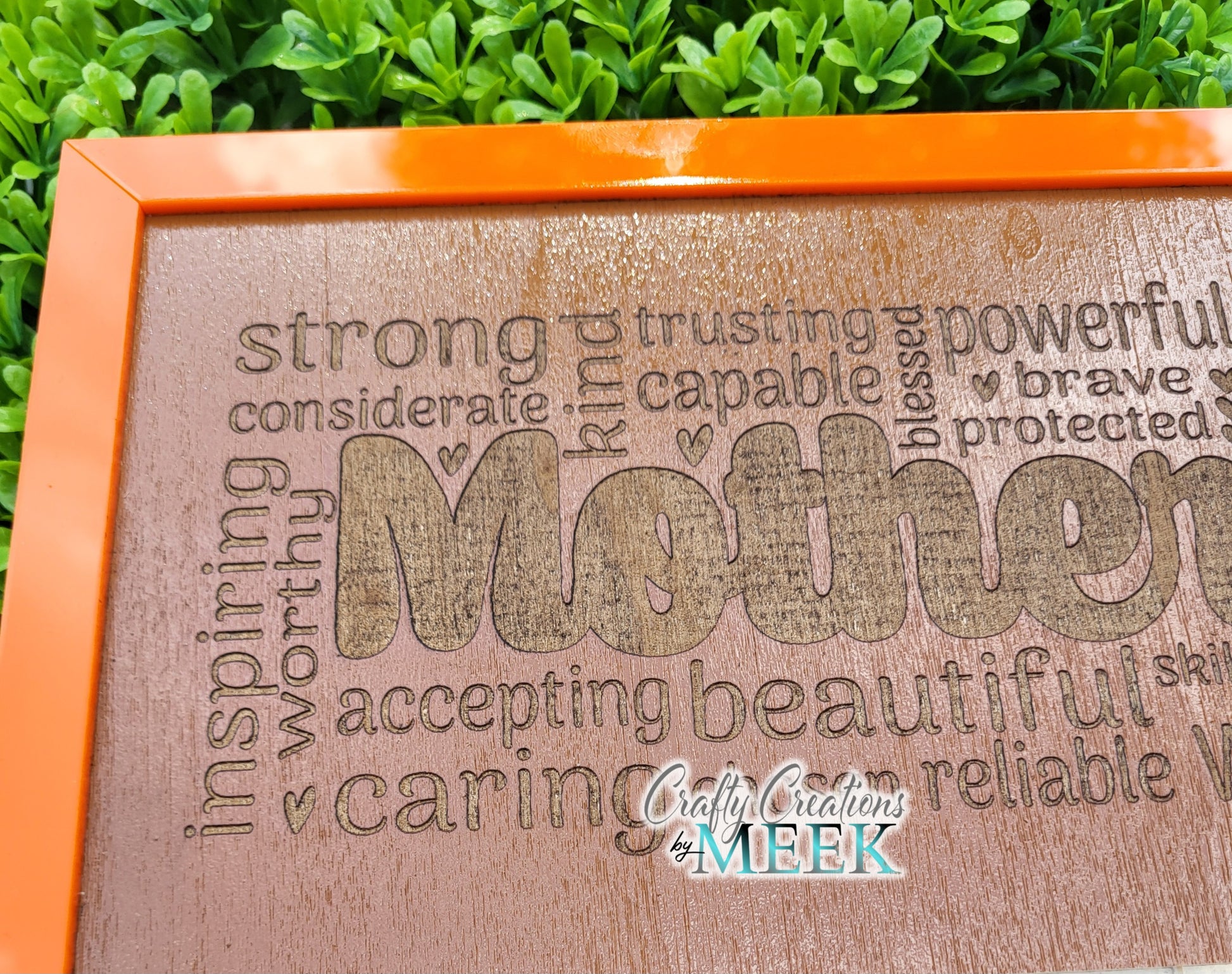 Laser-engraved "Mother" word art – Surrounded by affirming words like strong, caring, wise, and beautiful.