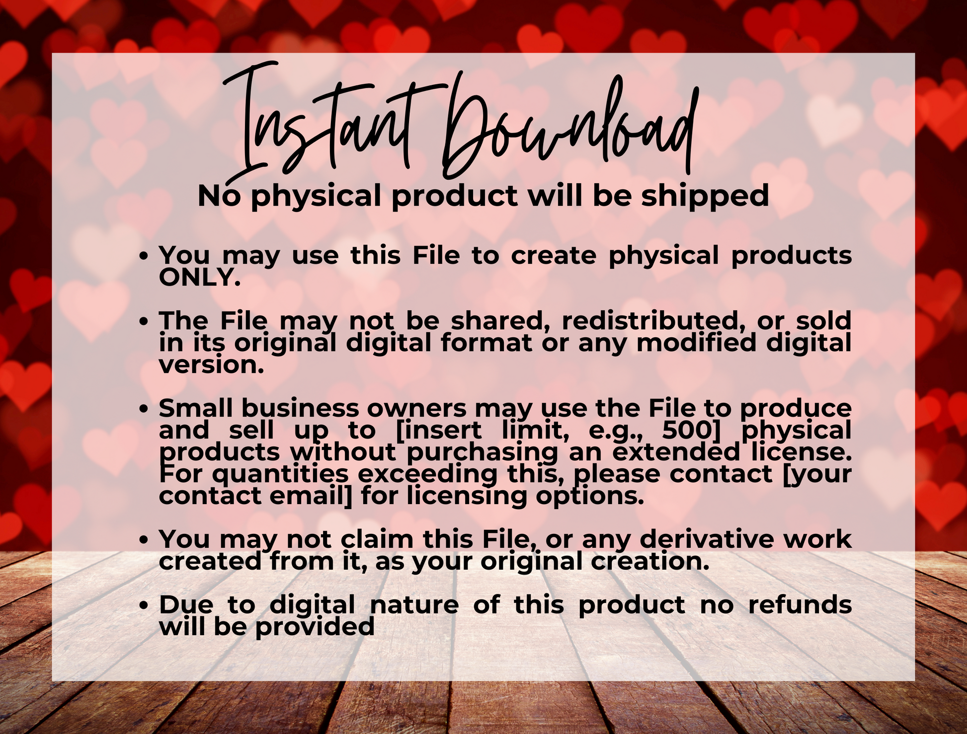 - You are not permitted to upload the File to websites, platforms, or marketplaces where it can be downloaded or used digitally by others (e.g., print-on-demand services like Zazzle or Redbubble).