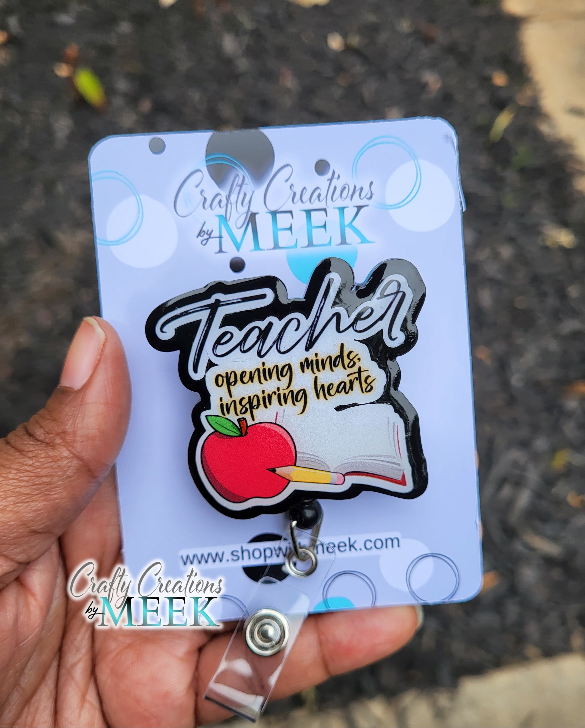 Teacher acrylic badge reel comes on a belt clip reel is perfect to hold IDs or keycard. They are handmade and coated in resin to last a long time. Acrylic measures approximately 2 inches and securely attached reel.