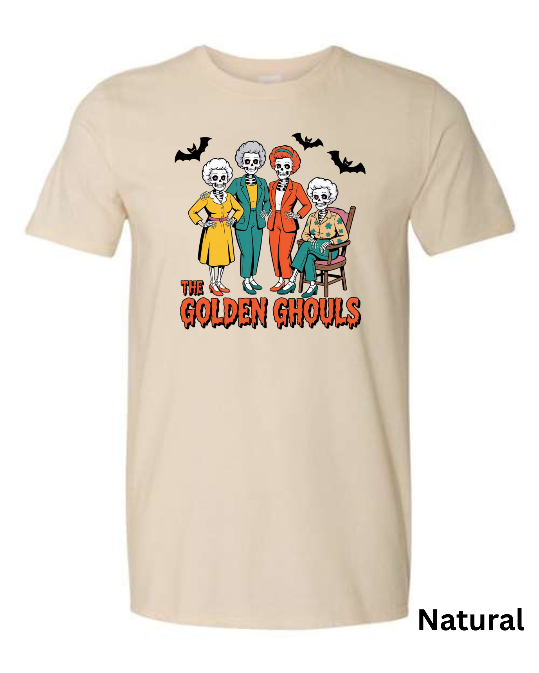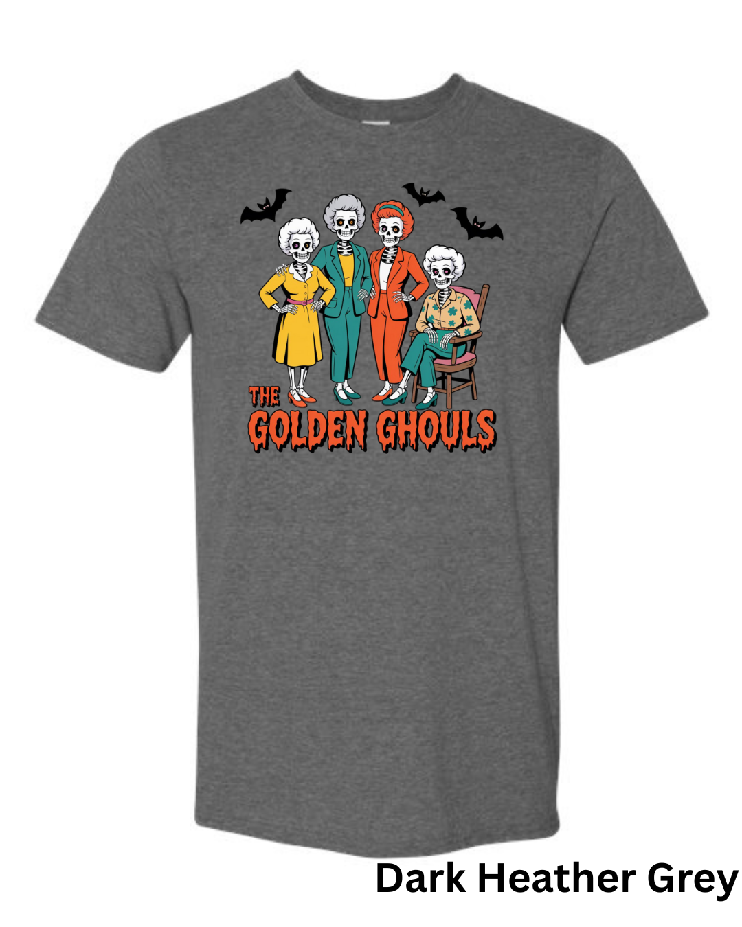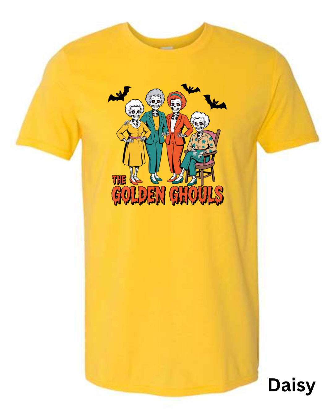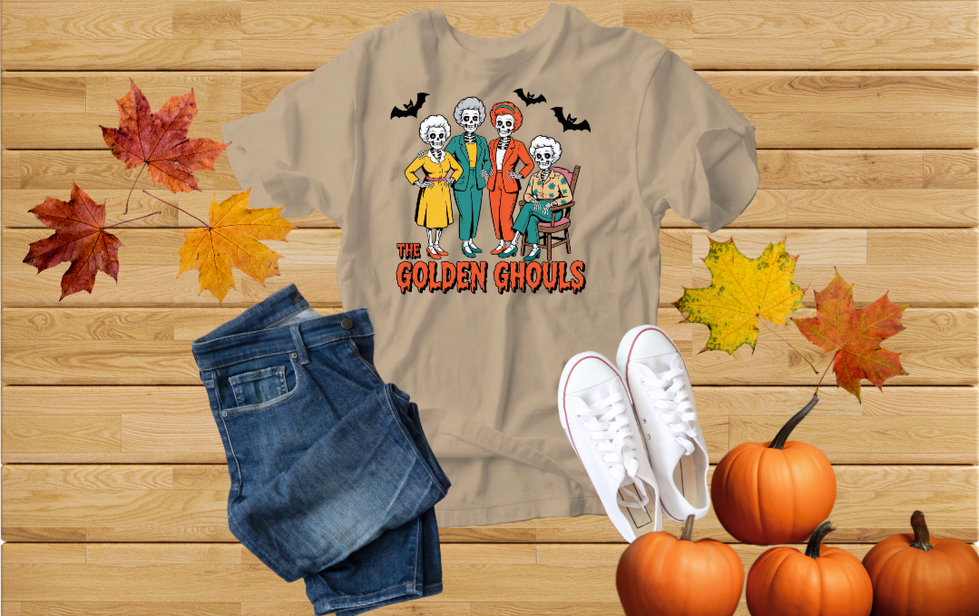 Add some spooky humor to your wardrobe with The Golden Ghouls T-Shirt! Featuring a playful skeleton twist on a classic TV favorite, this Halloween graphic tee is perfect for fans of retro comedy and creepy-cute style.