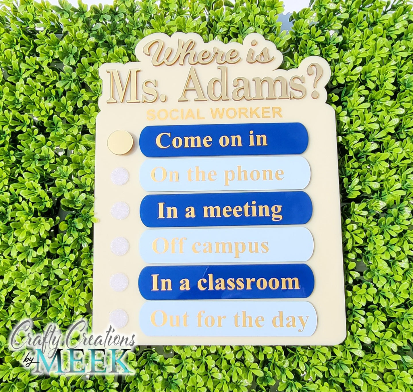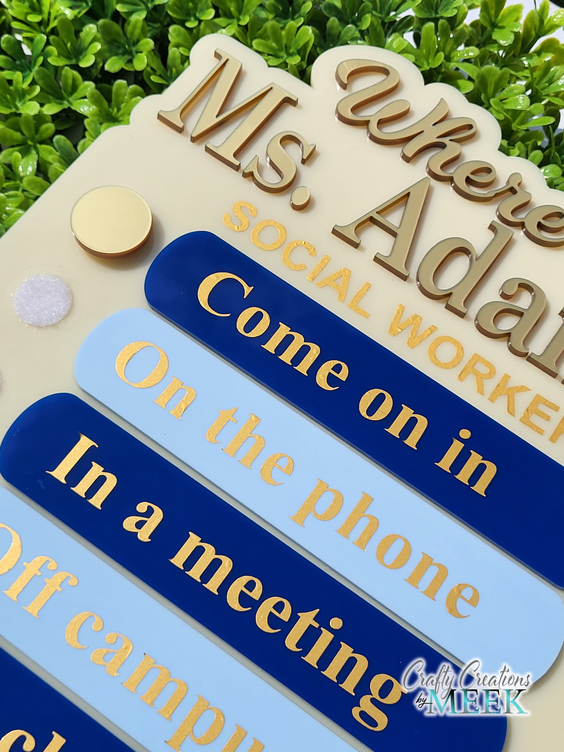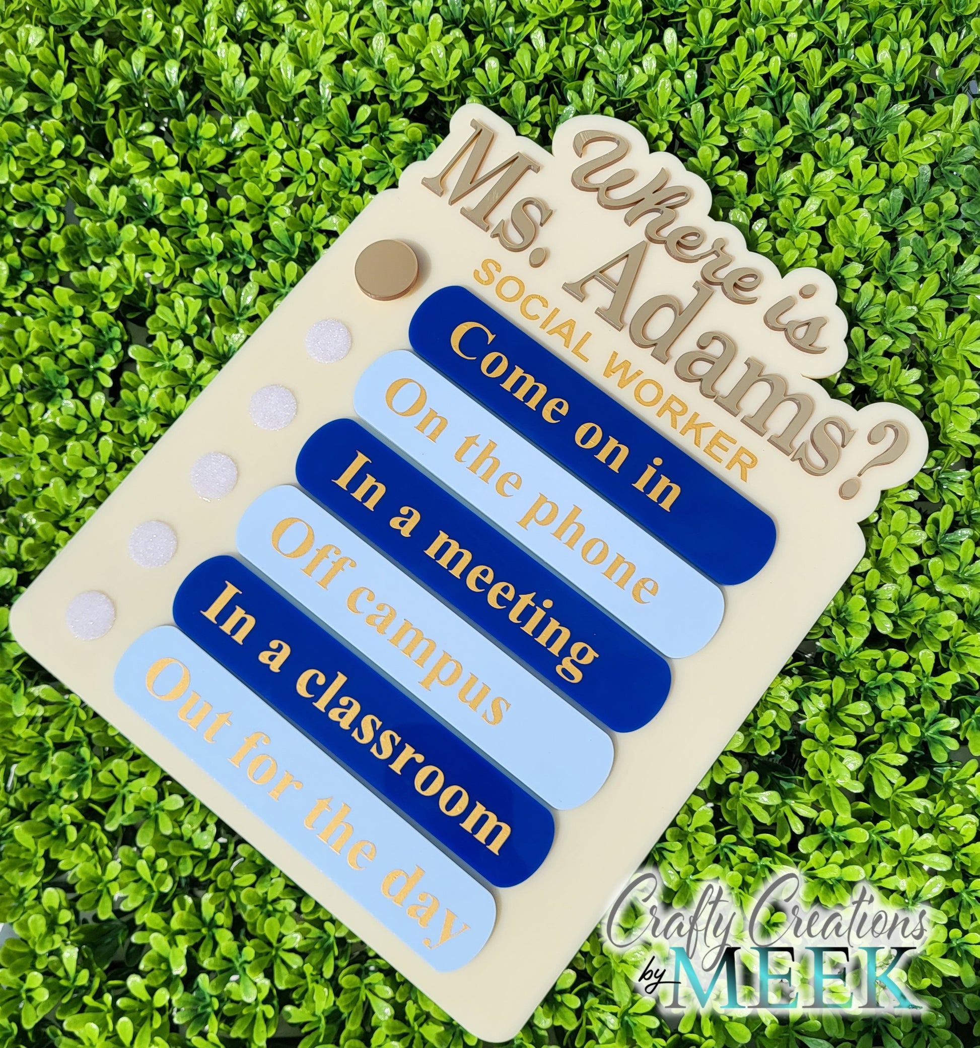 Our "Where is...?" Office Sign is the perfect way to securely let people know where an office occupant can be located. The acrylic sign can be installed on a door or wall and features bold lettering to help ensure your message is clear. This sign is also a great way to signal that a room should not be disturbed.